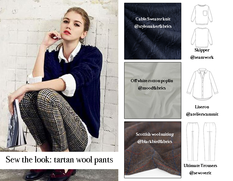 Fabric: wool tartan/check. Blackbird fabrics has in stock some Scottish wool suiting (which might sold out by the time this post will be out). Another shop to browse for wool is Minerva, that has a wide selection of check suiting fabric.