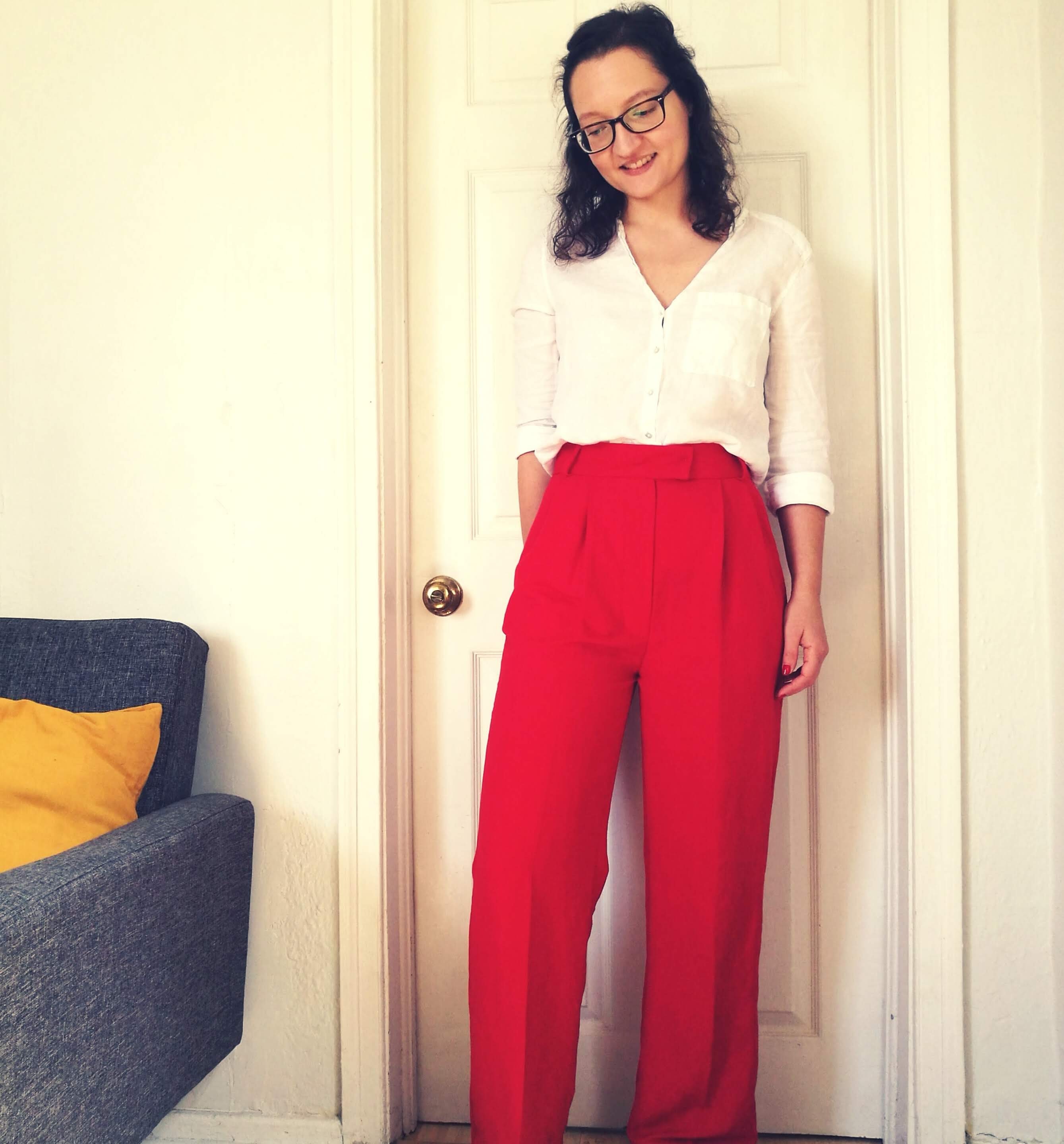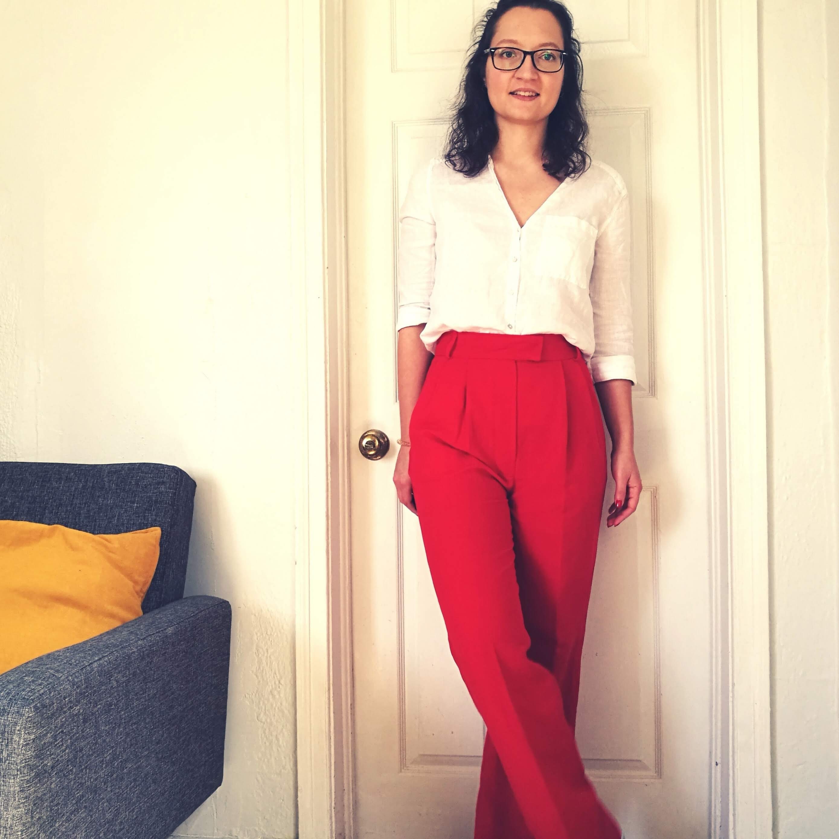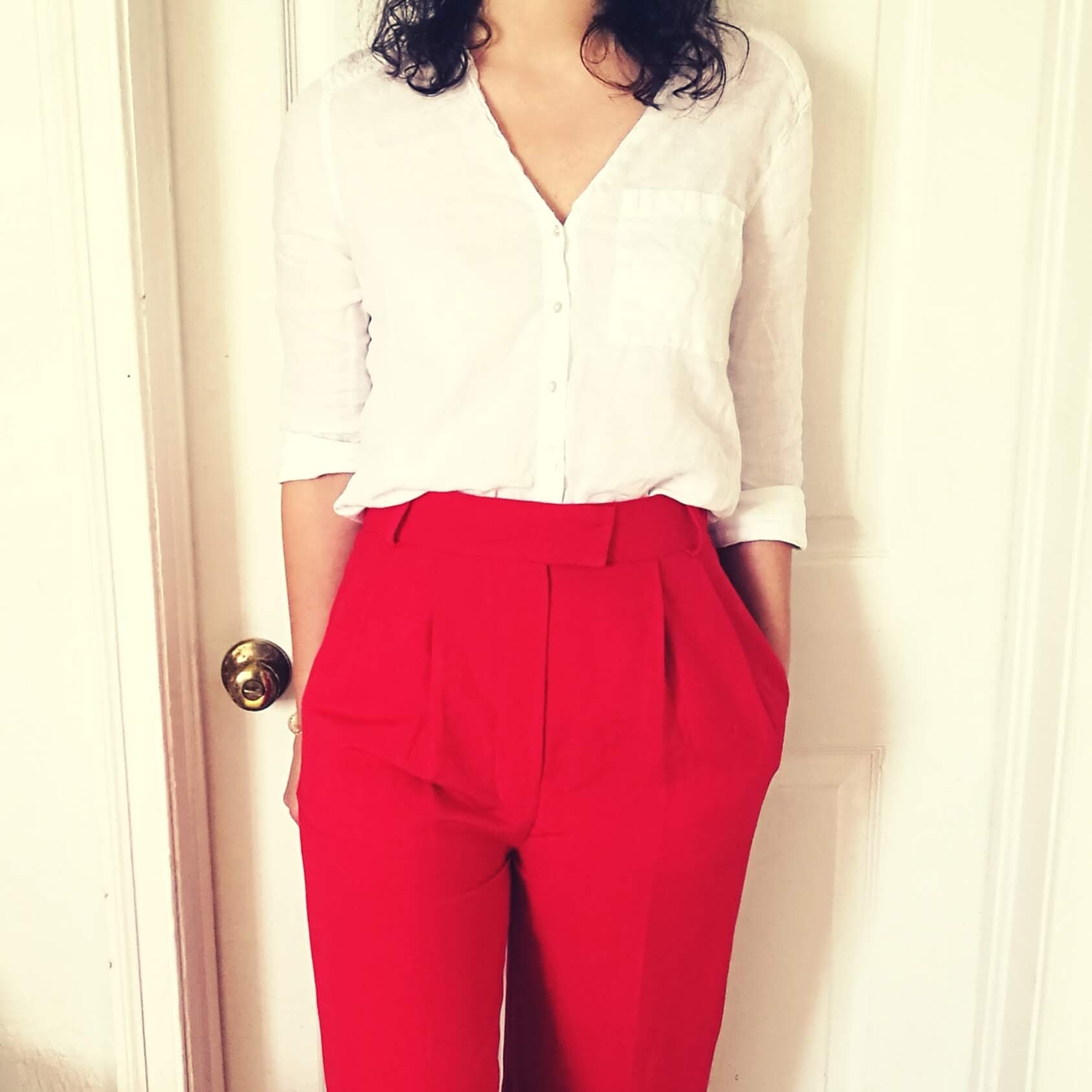 In my last blogpost on my Spring Summer Sewing plans you might have noticed that I’m planning to introduce some bright colors in my wardrobe. I don’t remember having ever had a pair of red pants, but I decided to make a pair and see how wearable and “matchable” they’ll be. My inspiration was this: