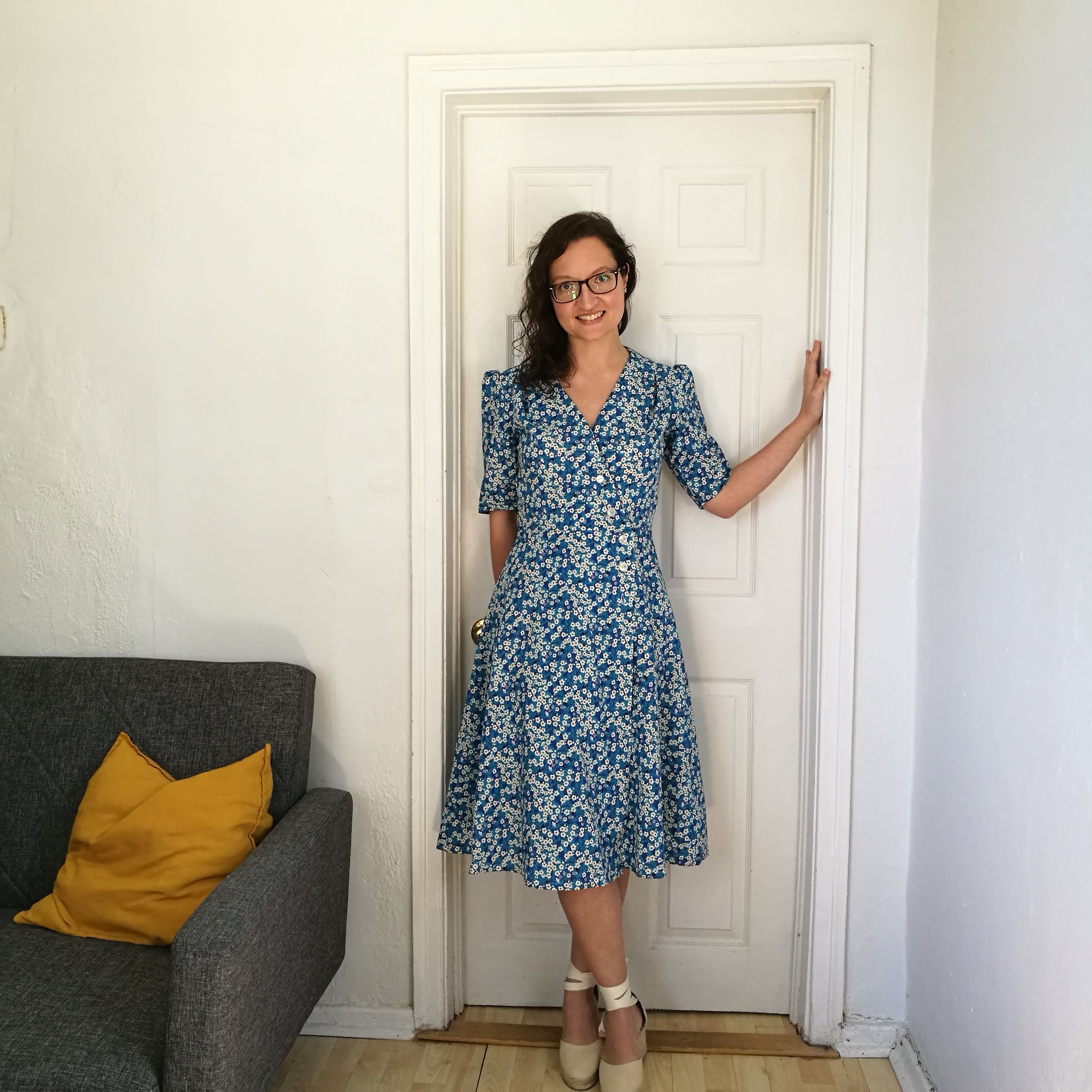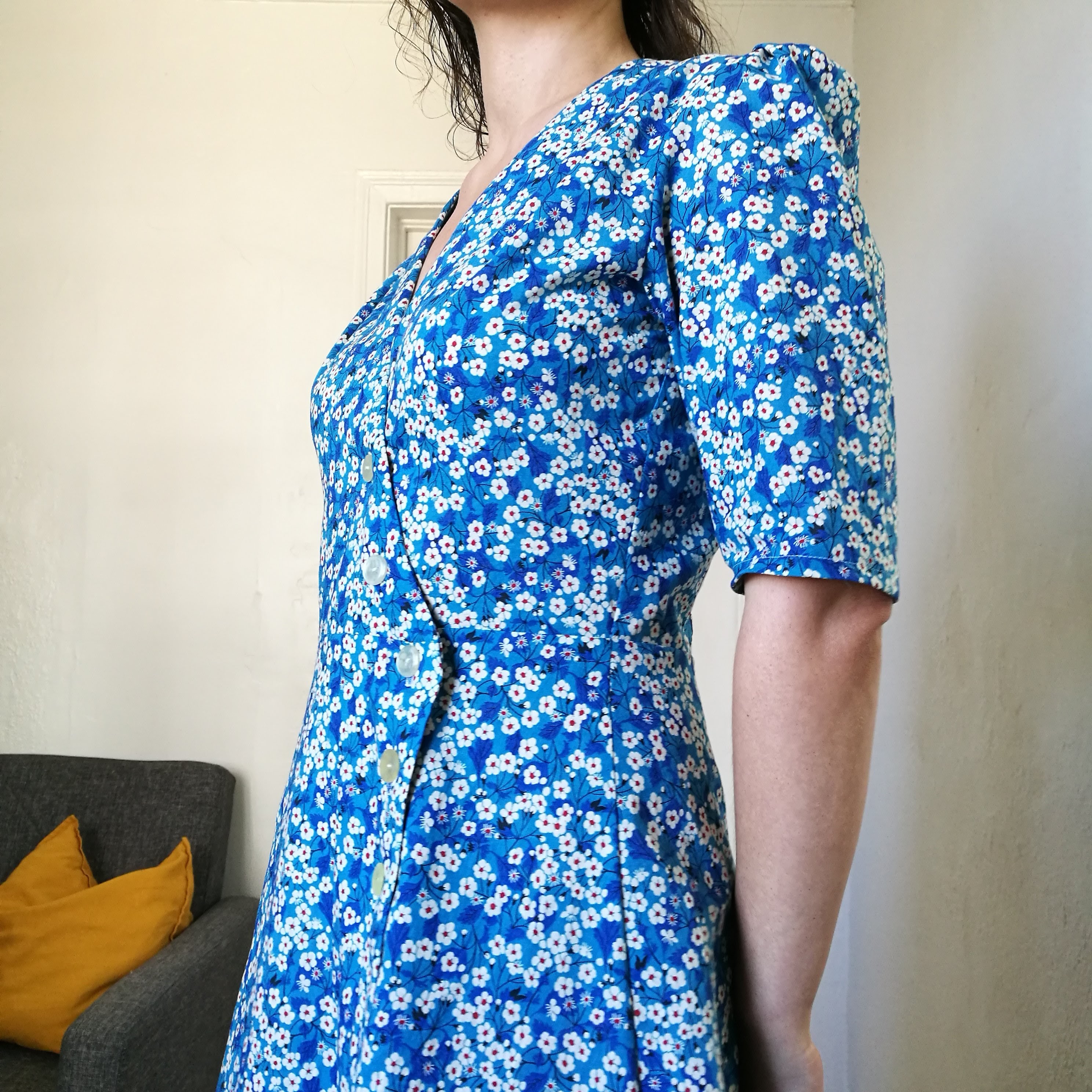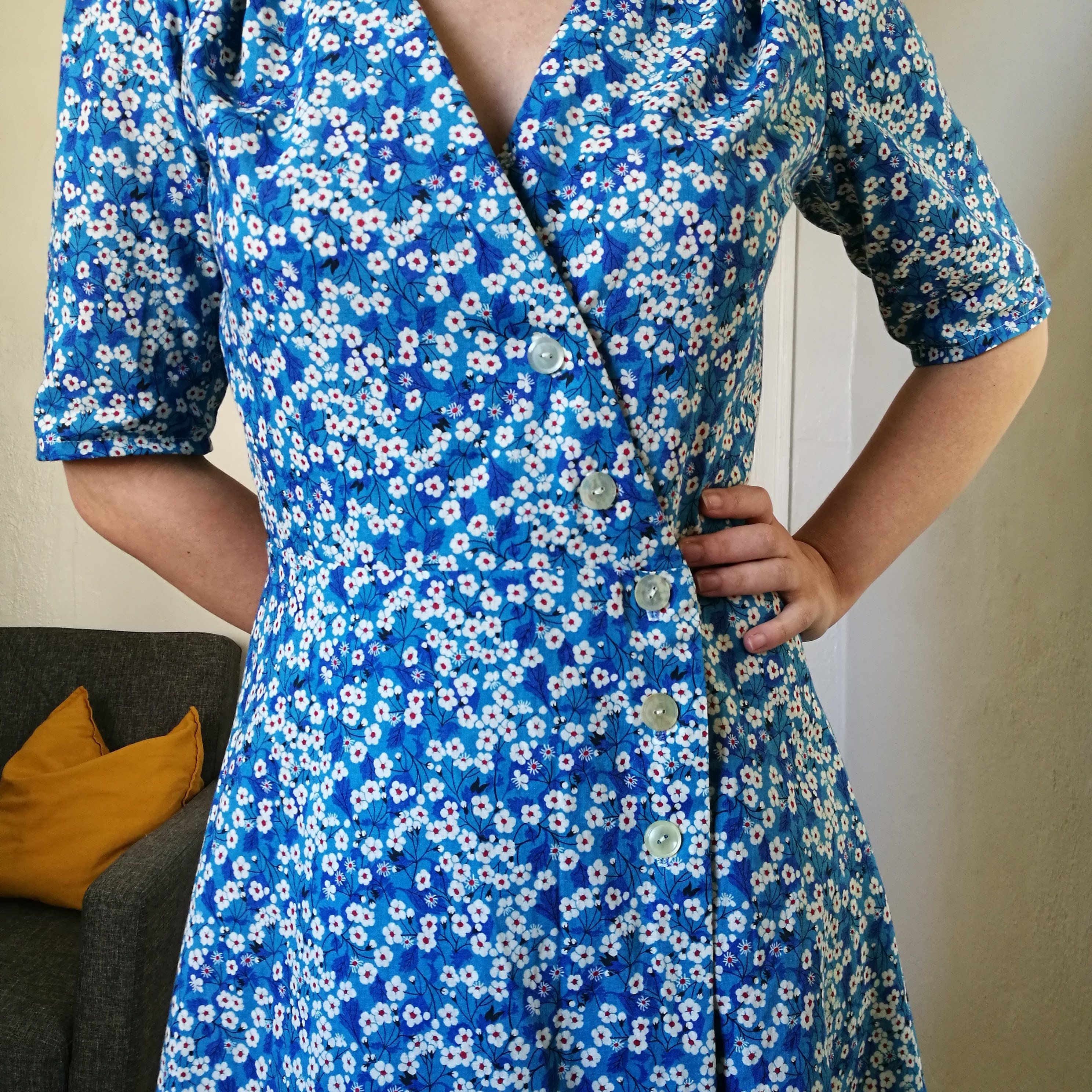 The fit of the bodice worked well for me (I made a size 14 based on the finished garment measures). I followed the instructions, but used french seams to have a nicer finish. I changed the buttons position to have them more similar to the inspiration picture, and I added an invisible button on the inside of the neckline. I also sew two small buttons on the waist seam to keep in place the part of the dress that goes under (left side when worn).