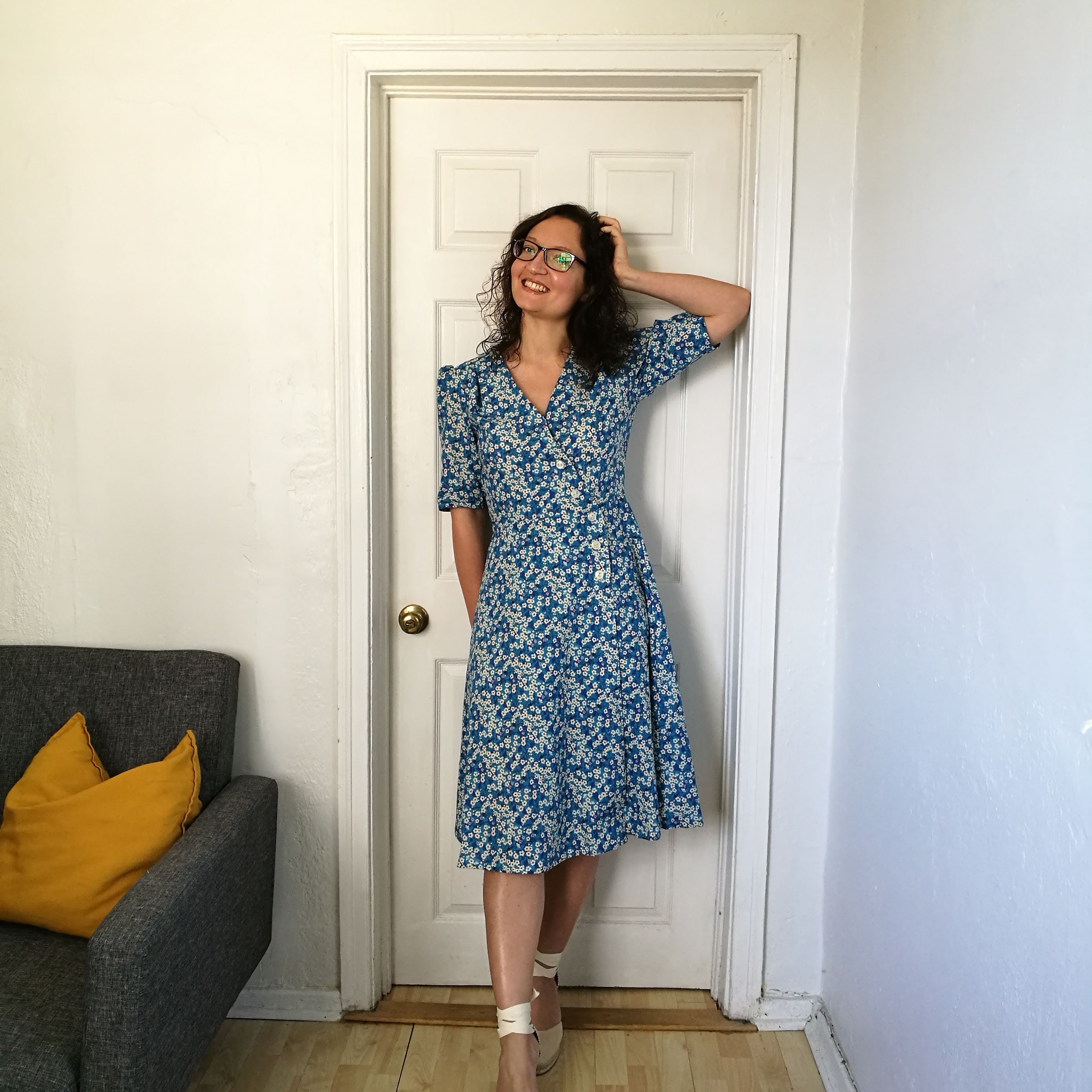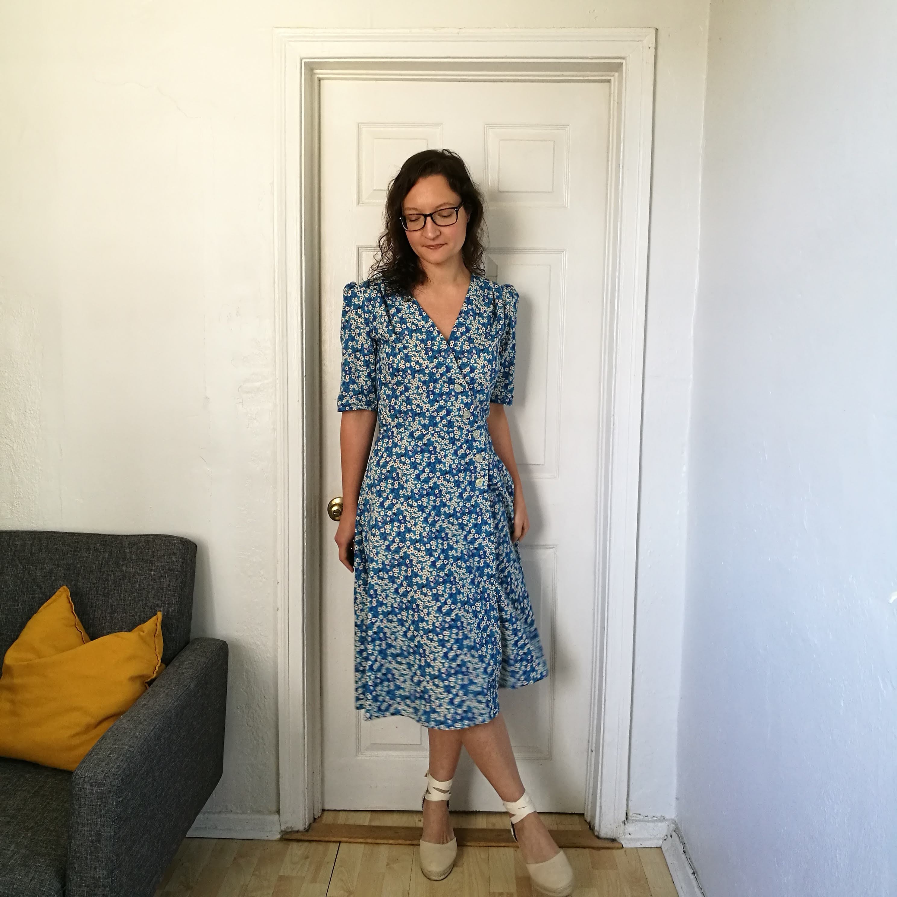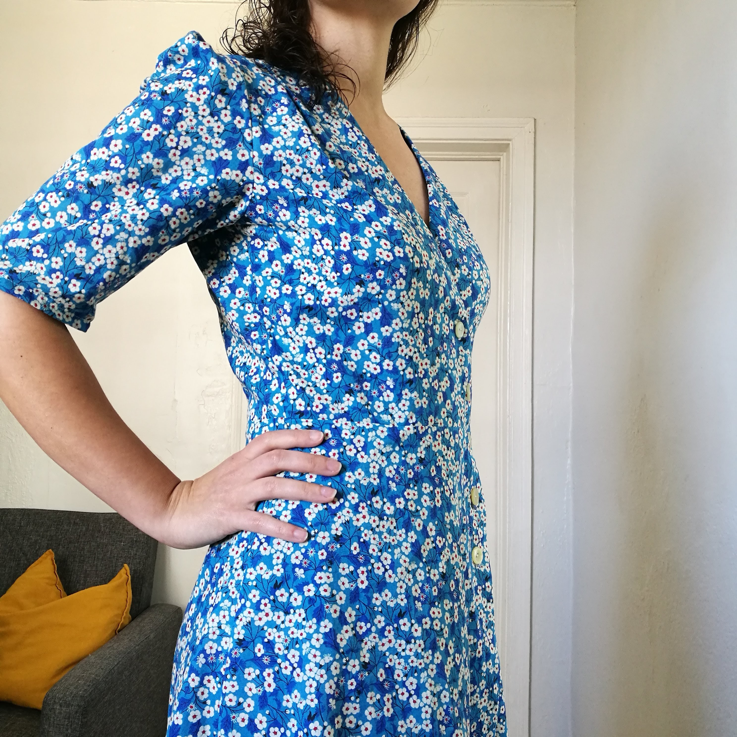 The fit of the bodice worked well for me (I made a size 14 based on the finished garment measures). I followed the instructions, but used french seams to have a nicer finish. I changed the buttons position to have them more similar to the inspiration picture, and I added an invisible button on the inside of the neckline. I also sew two small buttons on the waist seam to keep in place the part of the dress that goes under (left side when worn).