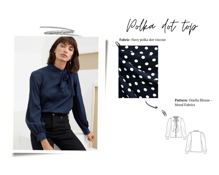 I had some viscose navy polka dot fabric (32” long plus one long edge, by 58” wide), that I thought could work well as a sleeveless pussybow blouse. I used the free Onella pattern from Mood fabrics, finishing the sleeve edge with bias binding.