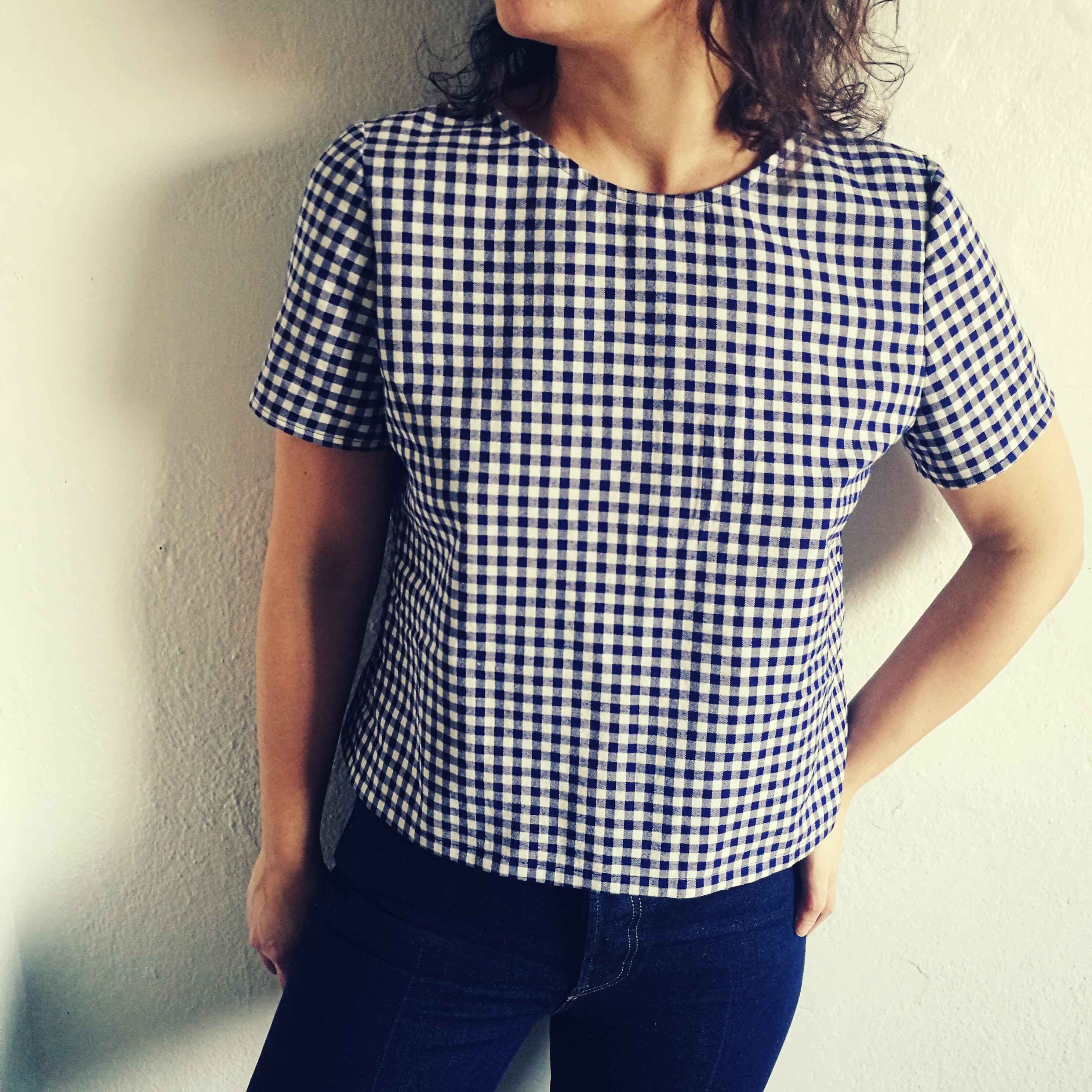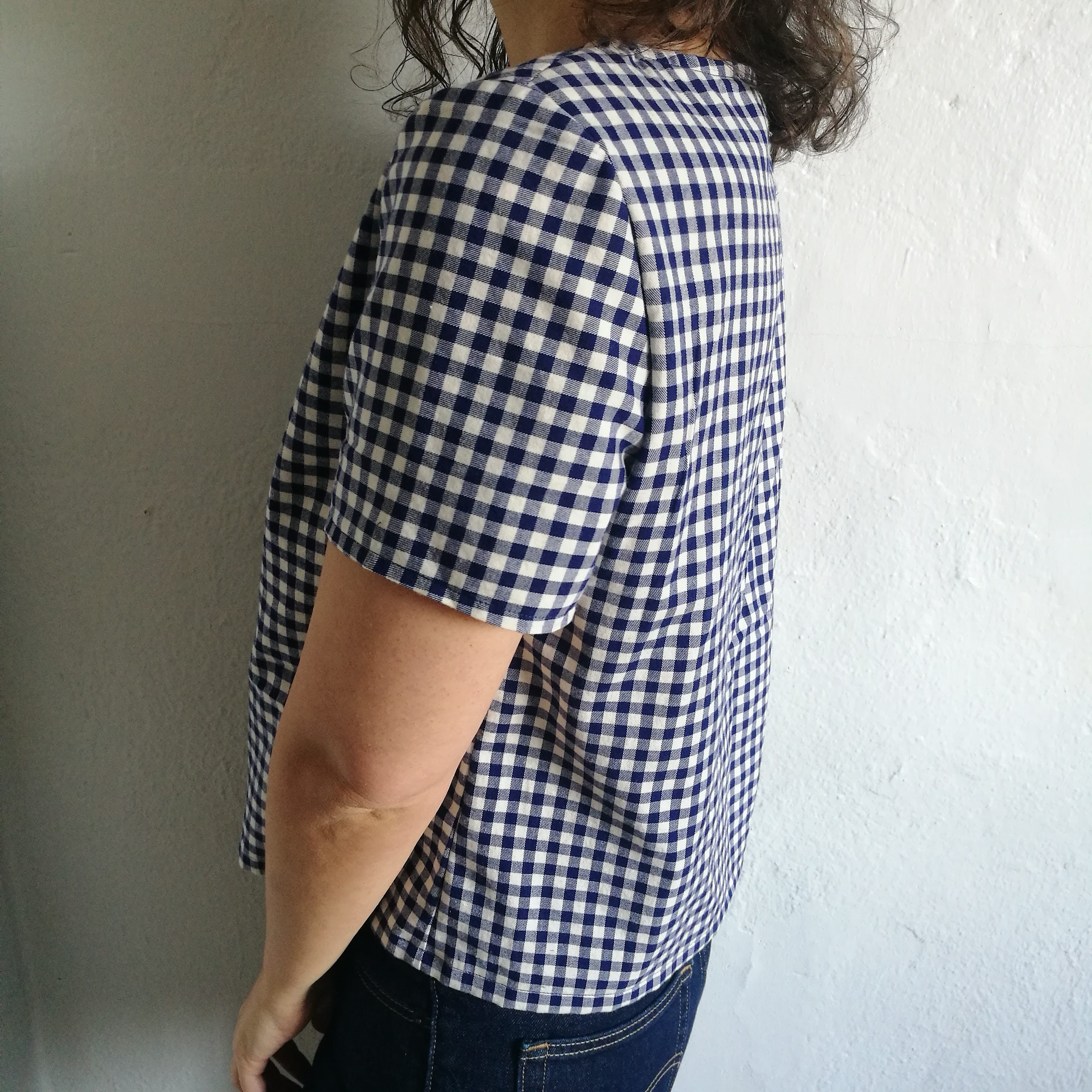 This first blouse is a success, and that why I’m planning to use my block for several versions. I already make a second one, which couldn’t be more different! It’s a pajama top, in a gingham brushed cotton. I used the same block, but drafted a sort of boat neckline, finished with bias binding. I cropped it by 3 1/2″ and choose to have a slightly more boxy fit, by reducing the side seam allowance down to 3/8″, instead of 5/8″.