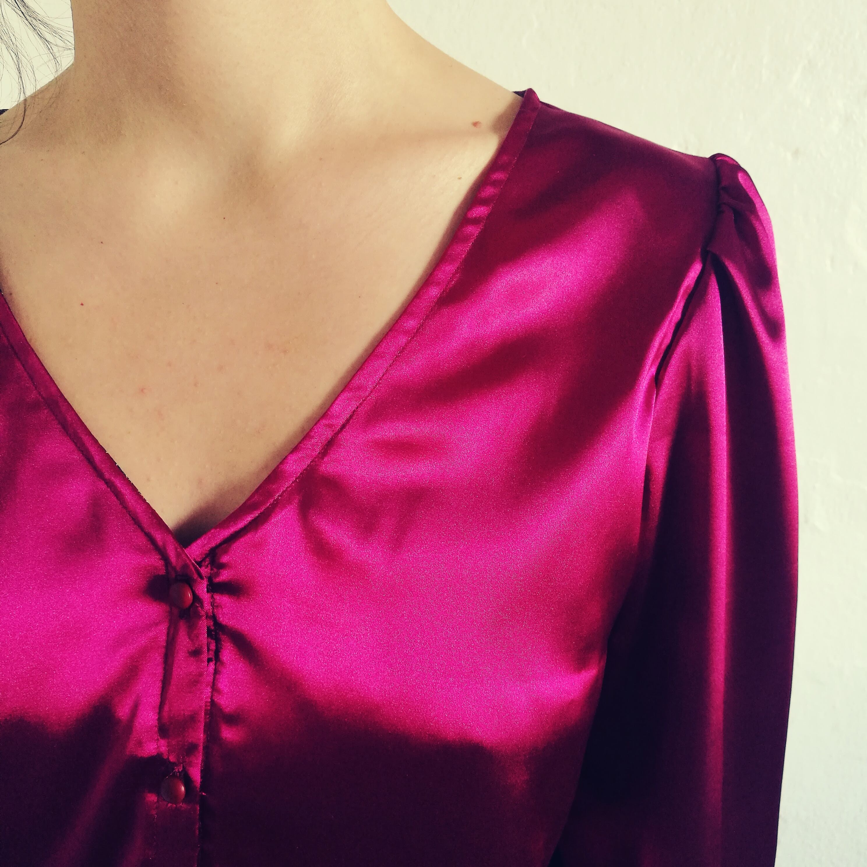 Now, it’s not my usual color 🙂 I choose I bright fuschia pink, quite shiny. I got this fabric last summer in Italy, for something like $3/meter. It’s a viscose blend, which is a little bit of a pain to sew, but I quite like it matched either with denim or light color pants.