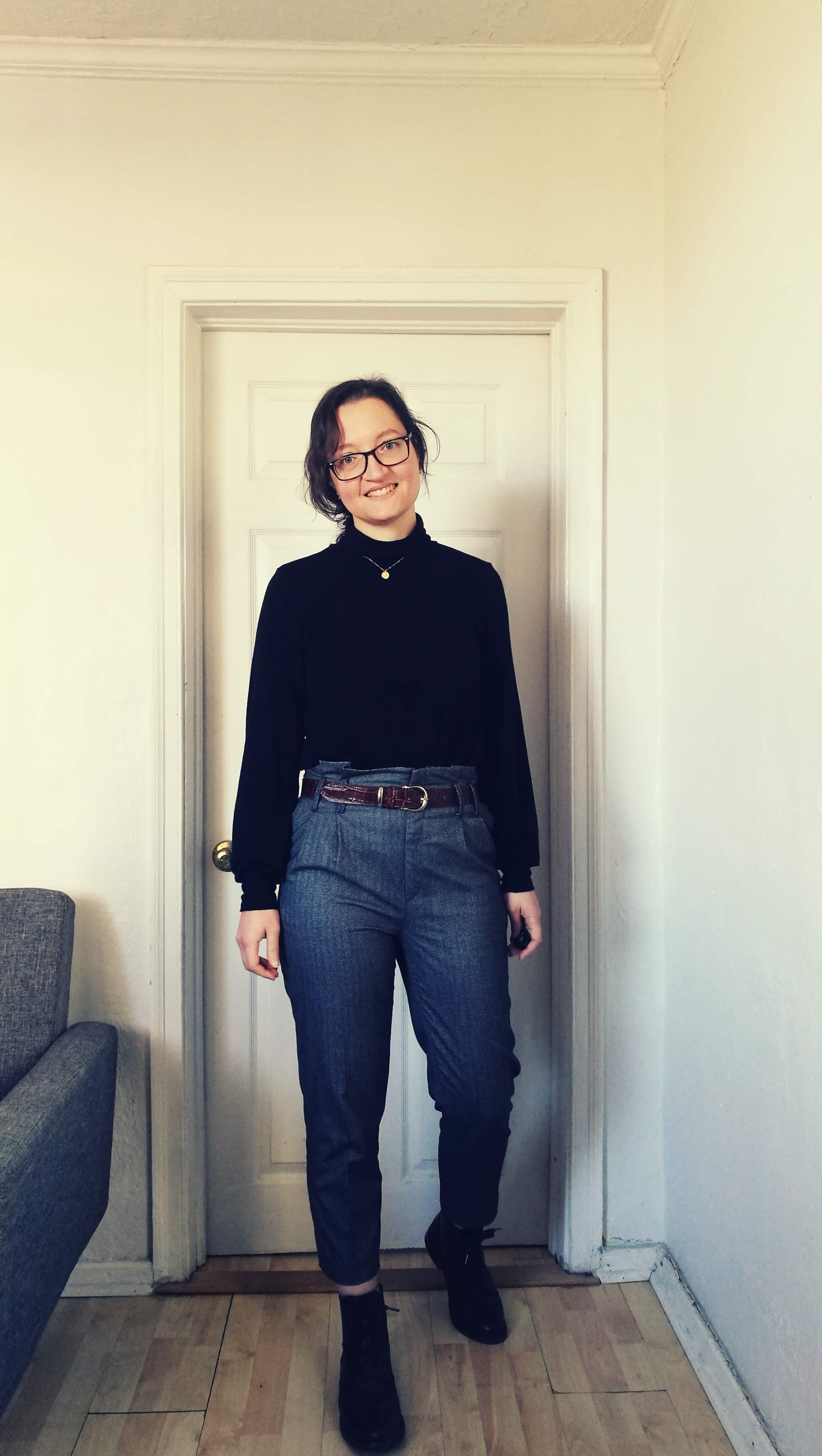 I’m very happy with everything I made, and I’m wearing this “capsule wardrobe” constantly. The items I wore the most are the Tatjana Trousers, my handmade sweater, all the knit tops and underwear. Those I wear less are the checked shirt (mainly because the weather cooled down quite quickly and it was too cold to wear it) and the silk skirt. While I know I’ll wear the shirt more in the next few months, I’m unsure about the skirt. I guess I should try a couple of different outfit that make me feel comfortable to remind myself to wear it. As an example, this is what I wore last week! If you want to see the clothes in movement check out my instagram for my first Reel!